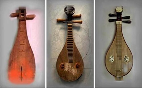 ▲左:原先的柳琴只有2根弦、7個(gè)品,俗稱“土琵琶”;中:第一次改革后的柳琴增加到3根弦、24個(gè)品,音域和音色都有了較大的提升;右:現(xiàn)在定型的柳琴已經(jīng)是4根弦、29個(gè)品了。