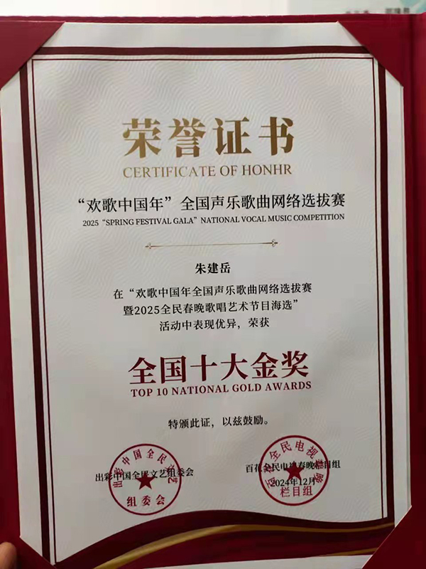 2025年1月13日朱建岳老師參加央視錄播基地(網(wǎng)絡(luò)春晚)錄制活動,并獲得“歡樂中國年,金曲迎新春,全國聲樂歌曲網(wǎng)絡(luò)選拔賽全國十大金獎”。