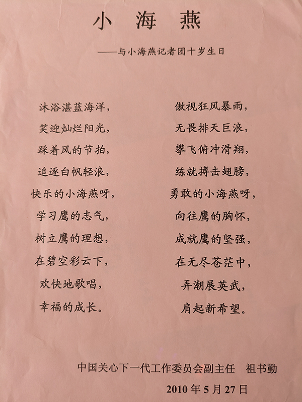 中國關工委常務副主任祖書勤聽說小海燕記者團成立十周年了,專門為“小海燕”寫了一首詩,題目是:“小海燕——與小海燕記者團十歲生日”,詩中寫道:
