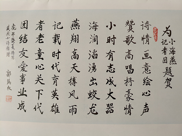 2010年6月1日在小海燕記者團成立十周年之際,國家、省、市領導紛紛來信來電題詞給予祝賀,中國關工委常務副主任郭錫全也十分高興,興奮之余為小海燕記者團寫了一首臧頭詩,并親筆書寫寄給小海燕記者團,臧頭詩題為“為小海燕記者團題賀”,臧頭詩為七言八句: