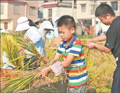 廣西壯族自治區(qū)賀州市富川瑤族自治縣富陽(yáng)鎮(zhèn)竹梢村,小朋友在體驗(yàn)打稻谷。