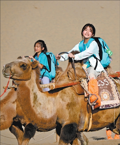 甘肅省敦煌市鳴沙山月牙泉景區(qū),小朋友在體驗(yàn)騎駱駝。