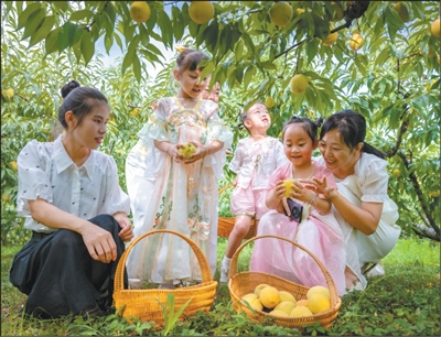 安徽省蕪湖市繁昌區(qū)孫村鎮(zhèn)“樂田小鎮(zhèn)”生態(tài)農(nóng)莊桃園,家長(zhǎng)帶領(lǐng)孩子們?cè)隗w驗(yàn)黃桃采摘。
