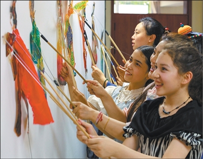 新疆維吾爾自治區(qū)烏魯木齊市天山區(qū)勝利路街道羊毛湖社區(qū),孩子們?cè)隗w驗(yàn)皮影戲表演。