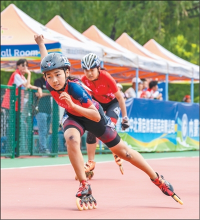 青少年選手在參加2025內(nèi)蒙古國(guó)際輪滑公開賽速度輪滑比賽。