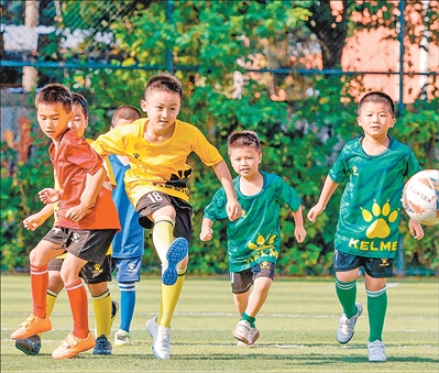 江西省吉安市峽江縣足球夏令營(yíng),孩子們?cè)谶M(jìn)行足球訓(xùn)練。