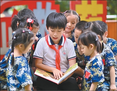 位于重慶市沙坪壩區(qū)的四川外國(guó)語大學(xué)附屬小學(xué)校幼兒園,少先隊(duì)員為幼兒園小朋友朗讀紅色故事。