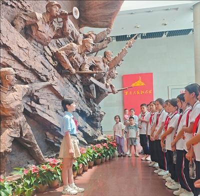 位于山西省陽(yáng)泉市的百團(tuán)大戰(zhàn)紀(jì)念館,一名“紅領(lǐng)巾講解員”在為“石榴籽一家親”2025年晉疆青少年融情夏令營(yíng)的學(xué)生進(jìn)行講解。暑假期間,共青團(tuán)陽(yáng)泉市委、陽(yáng)泉市少工委組織開展了“紅領(lǐng)巾講解員”志愿服務(wù)活動(dòng),幫助來參觀的學(xué)生更好地了解紅色歷史和文化。