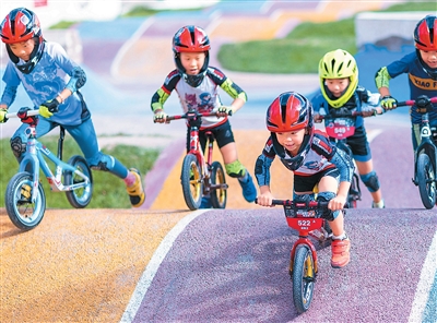 8月22日,甘肅省張掖市一處彩虹泵道騎行區(qū),佩戴護(hù)具的“小騎士”在波浪起伏的泵道上騎行。
