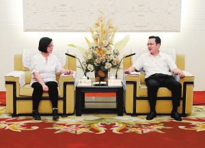 市委書記張國華與焦裕祿二女兒、音樂劇《焦裕祿》總策劃焦守云親切交談。