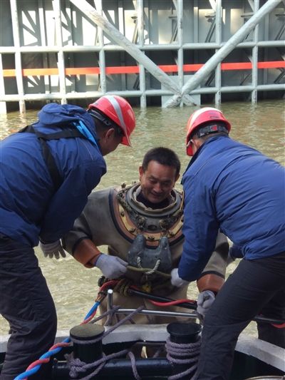 這扇水下閘門長約11.5米,厚1米多,全部是鋼結(jié)構(gòu),重70多噸,老李“摸”了20多年,可以說任何一顆螺絲的位置,他都了然于胸。不一會兒,他就發(fā)現(xiàn)水下有異物存在,有影響閘門開關(guān)的可能性。老李判斷出水下異物一個是石塊,一個是破碎的輪胎,于是通過對講機向岸上匯報,他的老搭檔朱永明隨即放下了兩根繩子,一根繩子上系著吊籃。老李摸索著用繩系住輪胎,再將石塊搬入籃中。向岸上示意后,異物先后被拉出水面。將閘門水下部分又仔細(xì)查了一遍,確保沒有問題后,老李出水了。坐在甲板上,同事幫他旋下面罩的12顆螺絲,摘下面罩的老李長出一口氣。這時,記者才發(fā)現(xiàn)和厚重的潛水服相比,老李手上竟然只戴了一副薄薄的紗布手套,“沒辦法,手套戴厚了,就沒有手感了。”記者想幫他脫手套,他擺了擺手說,“現(xiàn)在還不行,得再等兩分鐘。下面水溫太低,現(xiàn)在脫了,手容易凍傷。過一會捂熱了,才能脫。”