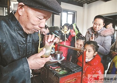 這次“尋年味”雅集,徐州市非遺保護辦公室也組織了幾位藝人前來助陣。糖人、糖畫、面塑的桌案邊上圍滿了小朋友。“爺爺,爺爺,給我吹一只兔子吧!”“阿姨,您能給我捏只恐龍嗎?”“我屬龍,給我畫只龍的糖畫吧。”……又好看又好吃的“新鮮”玩意讓小孩子們異常興奮?吹胶⒆觽儼烟鹛鸬奶钱嫹胚M嘴里的那一刻,臉上露出的笑容,一縷充滿甜味的童年記憶也浮上了大人的心頭。笑聲中,年味也是越來越濃了。