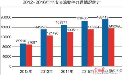2016年,全市法院受理案件186415件,審執(zhí)結(jié)149264件,分別是2012年的2.1倍和1.7倍;市中院受理15248件,審執(zhí)結(jié)12049件,分別是2012年的3.1倍和2.7倍。