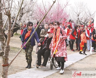 “大爺,您慢點,當(dāng)心樹枝……”早晨9點不到,景區(qū)門口就來了100多位敬老院的老人。他們在徐州陽光慈善志愿服務(wù)隊志愿者的攙扶下,在探梅園里慢慢逛著。徐州開放大學(xué)機電工程學(xué)院和徐州工程學(xué)院教科學(xué)院的50多名大學(xué)生志愿者也加入到助老隊伍中,幫助一些行動不便的老人推輪椅,看到好的景色就幫老人們拍照,幾位80多歲的老人樂得合不攏嘴。