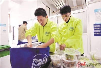 兩位送餐同學(xué),正在將打包好的盒飯放入專用的“我饞啦”送餐袋中。徐州日報記者 陳艷 攝
