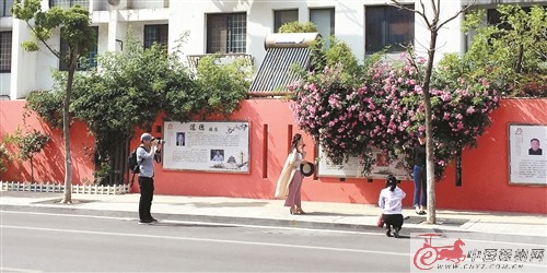 再往上,是翻過墻的薔薇,一束束,一叢叢,非常自然地和院內(nèi)的山茶花、海桐、毛竹連為一體,覆蓋著墻頭;◤缴、花叢中,是道德模范的宣傳展板,讓觀者更感親切。