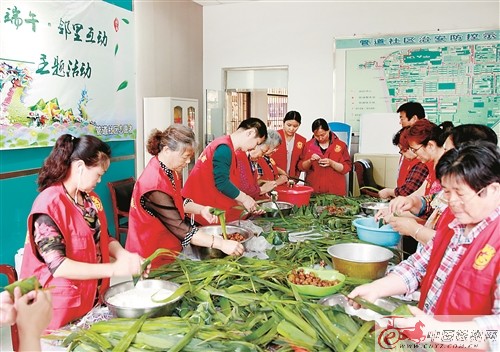 5月26日,鼓樓區(qū)九里街道徐礦城社區(qū)組織黨員志愿者和居民舉行包粽子活動,并把包好的粽子送給社區(qū)老黨員、孤寡老人和困難居民。徐州日報記者 孫井賢 通訊員 鼓組宣 攝 |