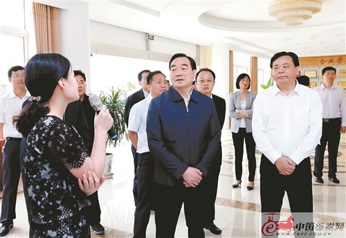 市長周鐵根等領(lǐng)導(dǎo)在江蘇九旭藥業(yè)集團,詳細了解企業(yè)生產(chǎn)經(jīng)營發(fā)展情況。 徐州日報記者 齊浩 攝