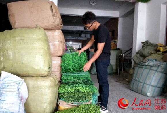 喬江在清點(diǎn)即將發(fā)給客戶的仿真花草產(chǎn)品。