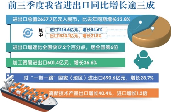 前三季度,我省進(jìn)出口增速比全國快17.2個(gè)百分點(diǎn),居全國第6位,已連續(xù)7個(gè)月快于全國。其中,出口增速快9.4個(gè)百分點(diǎn),居第8位;進(jìn)口增速快32.3個(gè)百分點(diǎn),居第6位。從各季度看,增速均保持在30%以上,平穩(wěn)向好趨勢明顯。
