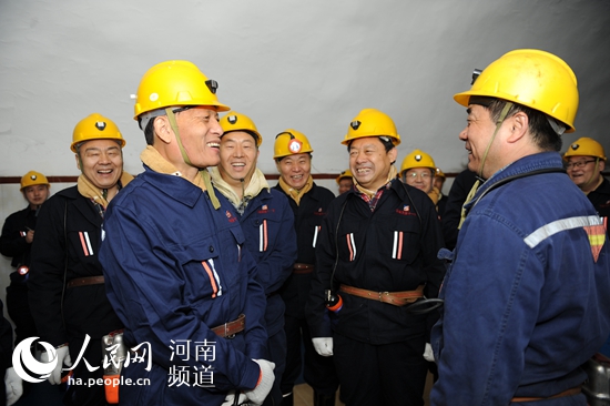 循聲而去,只見遠(yuǎn)處一群工人正圍在一起聊天。走到近前,中間一位身著藍(lán)色礦工服、腳穿黑色膠靴、頭戴黃色安全帽的“工人”引人注目,他是河南省委書記謝伏瞻。