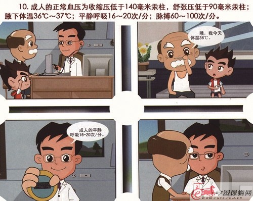 10. 成人的正常血壓為收縮壓低于140毫米汞柱,舒張壓低于90毫米汞柱;腋下體溫36℃~37℃;平靜呼吸16~20次/分;脈搏60~100次/分。