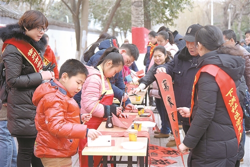 云興小學書法社團的小書法家們給大家義務寫春聯(lián)。