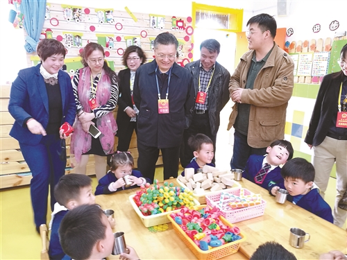 代表們首先視察了育苗、韓銘幼兒園,奎園社區(qū)幼兒看護點,每到一處都能看到孩子們在老師的引導下做游戲、學習文化知識。