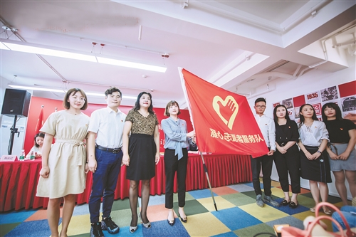 段莊街道黨工委書記葉冬梅為凝心志愿者團(tuán)隊(duì)授旗。
