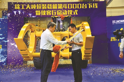 徐工鏟運(yùn)事業(yè)部領(lǐng)導(dǎo)向第4000臺大噸位裝載機(jī)交鑰匙。 通訊員 楊攻凱 攝