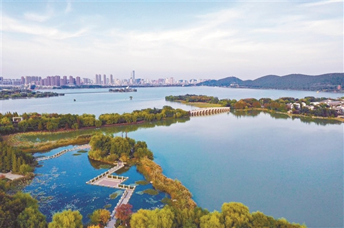 秋日的九里湖,湖面泛著粼粼波光,不時(shí)飛過的水鳥,讓人感受到大自然的生態(tài)之美。