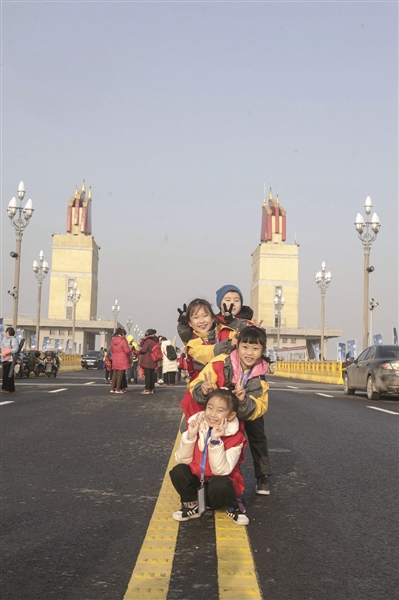 “當(dāng)我還只有兩個(gè)月大的時(shí)候,爸爸曾經(jīng)抱著我走上過(guò)長(zhǎng)江大橋,還留了一張照片。這些都是爸爸媽媽跟我講的。”這是南京力學(xué)小學(xué)金地自在城分校的趙志童記憶里的南京長(zhǎng)江大橋。參加活動(dòng)的揚(yáng)子小記者,大部分都和他一樣,在此之前和大橋的親密接觸,最多是乘汽車(chē)或是火車(chē)經(jīng)過(guò)。這一次能在大橋重新通車(chē)之前走上大橋,大家都覺(jué)得機(jī)會(huì)特別難得。別看小記者們個(gè)子還不高,但勁頭很足,不少都從南橋頭堡到北橋頭堡走了個(gè)來(lái)回,大冷天里走得額頭上都汗津津的。