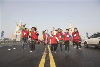 坐著、站著、跳起來(lái),小記者們的大橋留影活力十足。