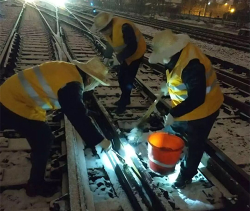 圖為鐵路工作人員清理道岔積雪
