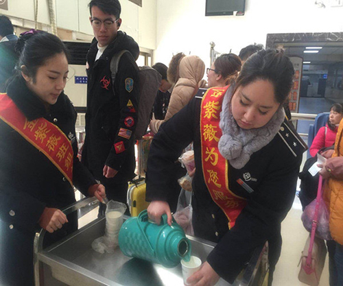 圖為客運站工作人員為旅客提供熱水