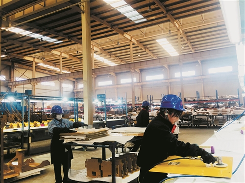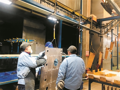 最引人注意的要數(shù)噴涂線了,長長的自動化產(chǎn)線上,一個個掛鉤緩緩旋轉(zhuǎn)著,工人們忙著將一個個焊接件掛上掛鉤,轉(zhuǎn)眼,銀色的焊接件便轉(zhuǎn)進(jìn)了噴涂房,待它們一個個再從噴涂房出來時,便已穿上了亮黃的外衣,負(fù)責(zé)下件的工人們再將它們逐一取下、摞齊。