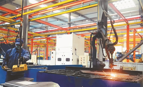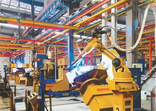 4月12日,藍(lán)海灣工程裝備產(chǎn)業(yè)園的世通重工生產(chǎn)車間里,機(jī)械手臂、焊接機(jī)器人配合默契,一轉(zhuǎn)一焊,巨大的機(jī)械底盤(pán)已輕松完成焊接工序。橘黃相間的開(kāi)闊車間里,機(jī)器嗡嗡,切割、吊裝、拋光、整型、噴涂、焊接等工序都實(shí)現(xiàn)了智能化作業(yè),零星幾名工人的主要任務(wù)就是控制好機(jī)械手的運(yùn)轉(zhuǎn),在焊接區(qū),則全部實(shí)現(xiàn)了無(wú)人化作業(yè)。