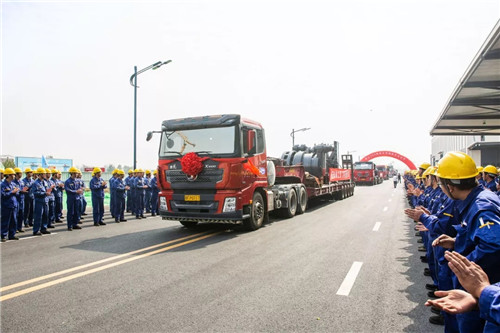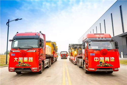 徐工700噸液壓挖掘機(jī)作為中國(guó)本土化品牌自主研發(fā)生產(chǎn)、國(guó)內(nèi)最大噸位的礦用挖掘機(jī),在中國(guó)露天采礦裝備發(fā)展史中具有里程碑式的意義。隨著發(fā)車的指令發(fā)出,滿載著徐工700噸液壓挖掘機(jī)結(jié)構(gòu)件的15臺(tái)發(fā)運(yùn)車依次緩緩駛出廠區(qū)。在激昂的音樂背景下,金色的徐工設(shè)備在藍(lán)天的映襯下顯得尤為絢爛震撼,猶如一隊(duì)隊(duì)英勇無畏地鋼鐵戰(zhàn)士沖鋒戰(zhàn)場(chǎng)。
