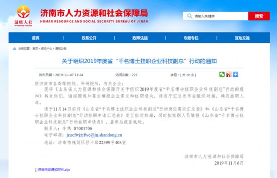 近日,記者從濟南市人力資源和社會保障局官方網(wǎng)站獲悉,濟南市面向駐濟高校、科研院所和有關(guān)企業(yè)下發(fā)《山東省人力資源和社會保障廳關(guān)于組織2019年度省“千名博士掛職企業(yè)科技副總”行動的通知》。這預(yù)示著2019年度省“千名博士掛職企業(yè)科技副總”行動正式啟動,掛職行動報名截止時間為11月14日。