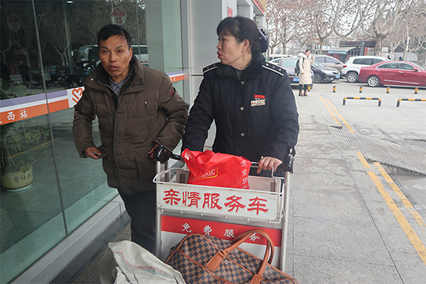 圖為黨員服務(wù)崗在幫乘客搬運行李
