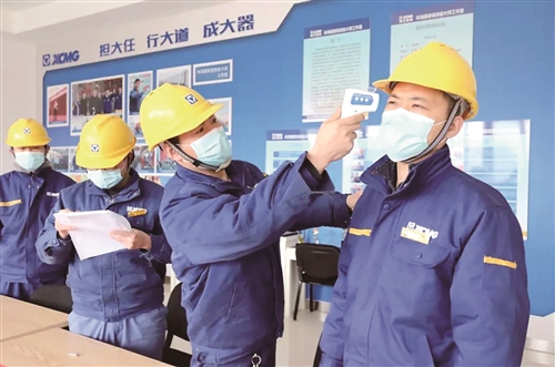 在嚴(yán)格的防控措施下,徐工集團(tuán)已復(fù)工。工廠門(mén)前、車間、辦公室、食堂設(shè)置了專門(mén)的防控措施,人員登記、體溫測(cè)量、宣講復(fù)工指南、食堂分餐或送餐到分廠、工段……為大家提供更多安全健康的保障。