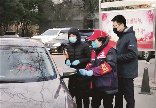 徐州市工人文化宮黨支部26名黨員踴躍走上街頭抗疫防控。圖為志愿者在漢風(fēng)社區(qū)志愿服務(wù)。 (劉濤)