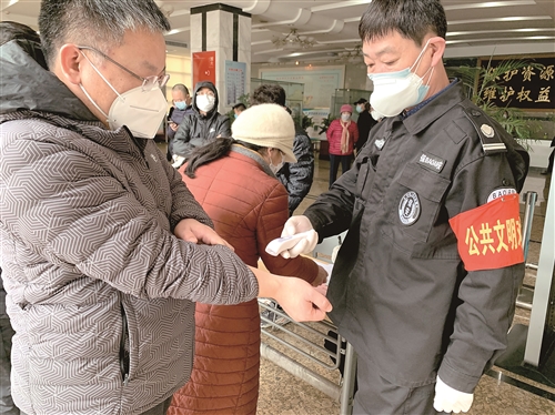 不動(dòng)產(chǎn)登記交易中心,工作人員測(cè)量體溫。