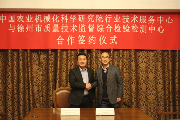 黃淮網(wǎng) 11月19日,徐州市質(zhì)量技術(shù)監(jiān)督綜合檢驗(yàn)檢測(cè)中心與中國農(nóng)業(yè)機(jī)械化科學(xué)研究院行業(yè)技術(shù)服務(wù)中心在京召開合作簽約儀式,徐州市質(zhì)量技術(shù)監(jiān)督綜合檢驗(yàn)檢測(cè)中心謝東主任與中國農(nóng)業(yè)機(jī)械化科學(xué)研究院趙慶亮副院長簽署合作協(xié)議,雙方合作項(xiàng)目相關(guān)負(fù)責(zé)人參加會(huì)議。