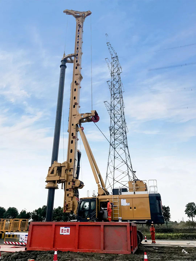 項(xiàng)目樁基施工多采用單樁基礎(chǔ),樁徑為2.8m,樁深最深可達(dá)102m。徐工XR450E動(dòng)力頭額定輸出450kN·m,六節(jié)摩阻桿114m鉆深,3m最大鉆孔直徑輕松啃下這條“超級(jí)高速公路”!