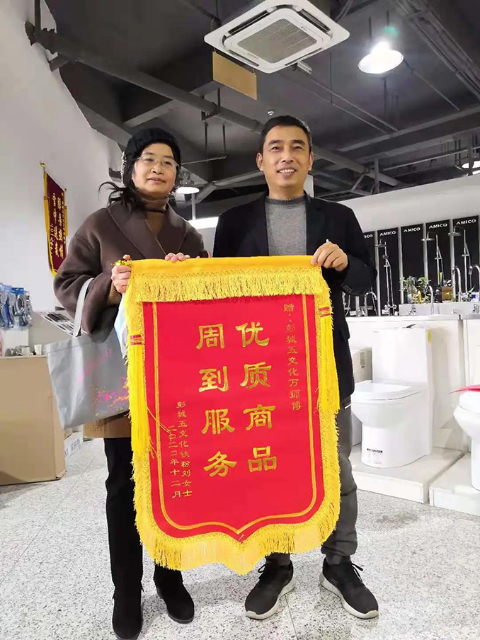 “優(yōu)質(zhì)商品 周到服務(wù)”——徐州市彭城五交化有限責(zé)任公司旗艦店水暖柜臺(tái)柜組長(zhǎng)萬新民再收錦旗。