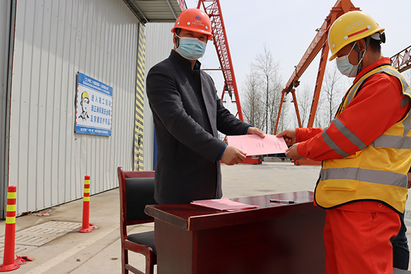 為推動形成黨政工團組織共同參與勞動競賽的良好氛圍,相關領導為參建隊伍授旗,以激發(fā)組織活力,充分發(fā)揮黨員先鋒崗、青年突擊隊帶頭作用。為壓實主體責任,確保施工進度,項目負責人與各作業(yè)班組層層簽訂責任書,立下軍令狀。