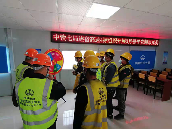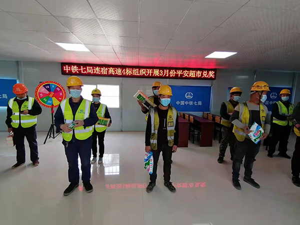 黃淮網(wǎng)(郭陽) 4月4日,中鐵七局連宿高速4標(biāo)項(xiàng)目在“平安先生”獎(jiǎng)勵(lì)超市開展平安先生兌獎(jiǎng)活動(dòng)。