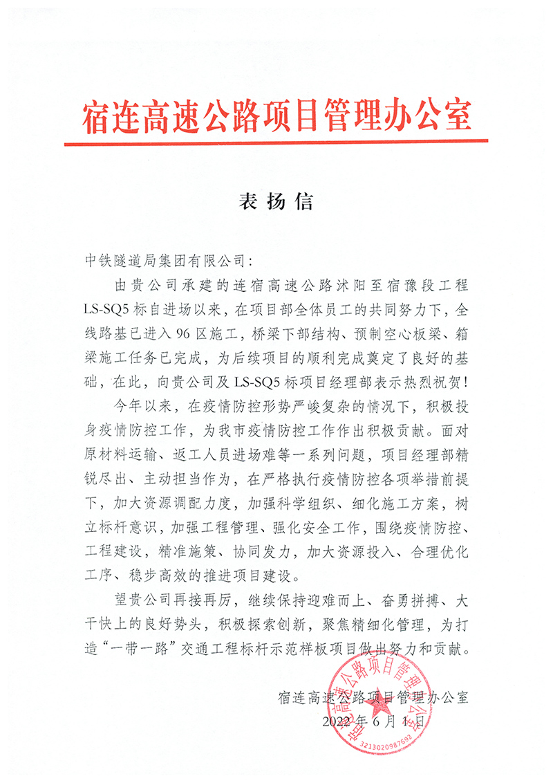 黃淮網(wǎng)(張榮 崔玉方) 6月2日,中鐵隧道局集團連宿高速公路5標項目收到業(yè)主宿連高速公路項目管理辦公室一封感謝信,對連宿5標項目在疫情下克服重重困難,圓滿完成橋梁下部結構、預制空心板梁、箱梁施工任務,為打造宿連品質工程做出貢獻表示祝賀和稱贊。