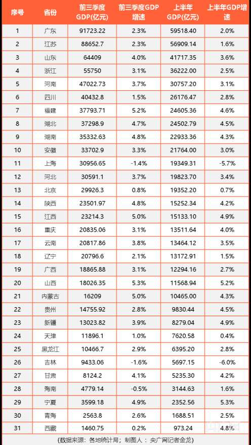 31省市前三季度GDP出爐:廣東、江蘇、山東居總量前三